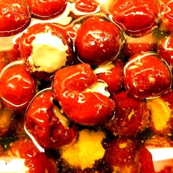 You will get 6 big handmade Cherry Peppers stuffed with thinly sliced Salami and a little chunk of sharp provolone.